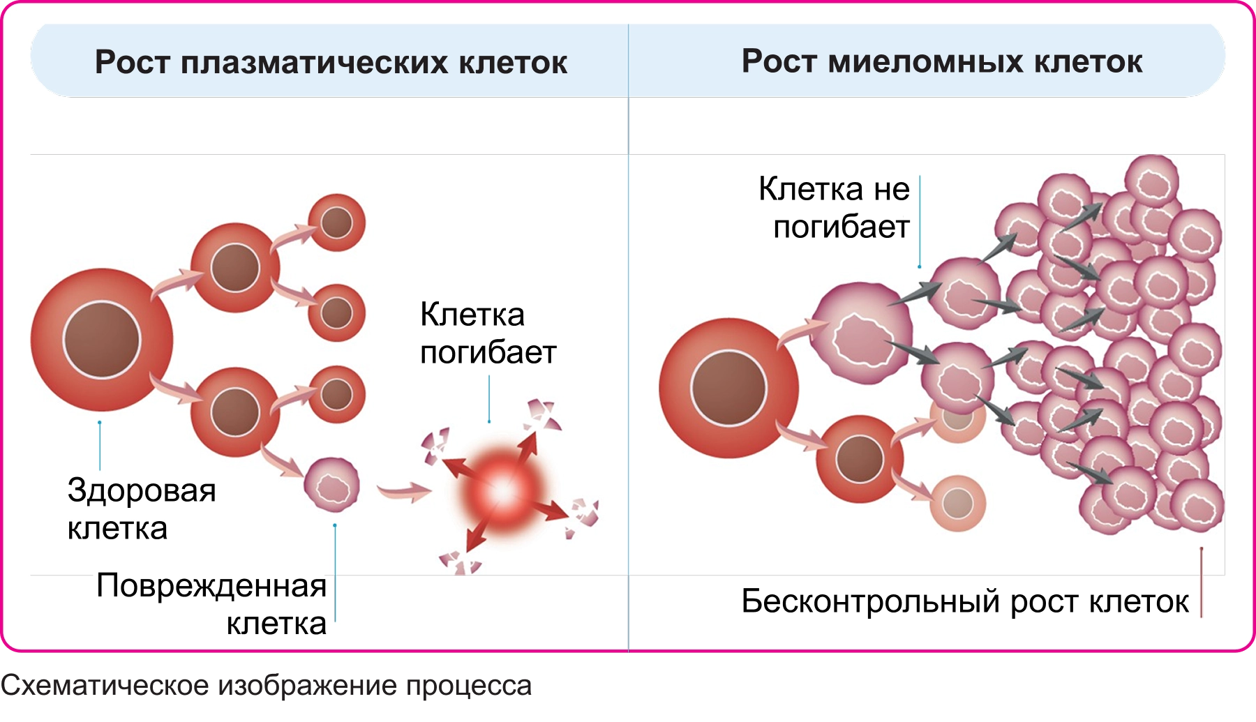 Множественная миелома – это разновидность онкологического заболевания крови, при котором злокачественные плазматические клетки начинают бесконтрольно размножаться, подавляя другие клетки, приводя к анемии, разрушению костной ткани и снижению выработки эритроцитов, лейкоцитов, тромбоцитов. 1